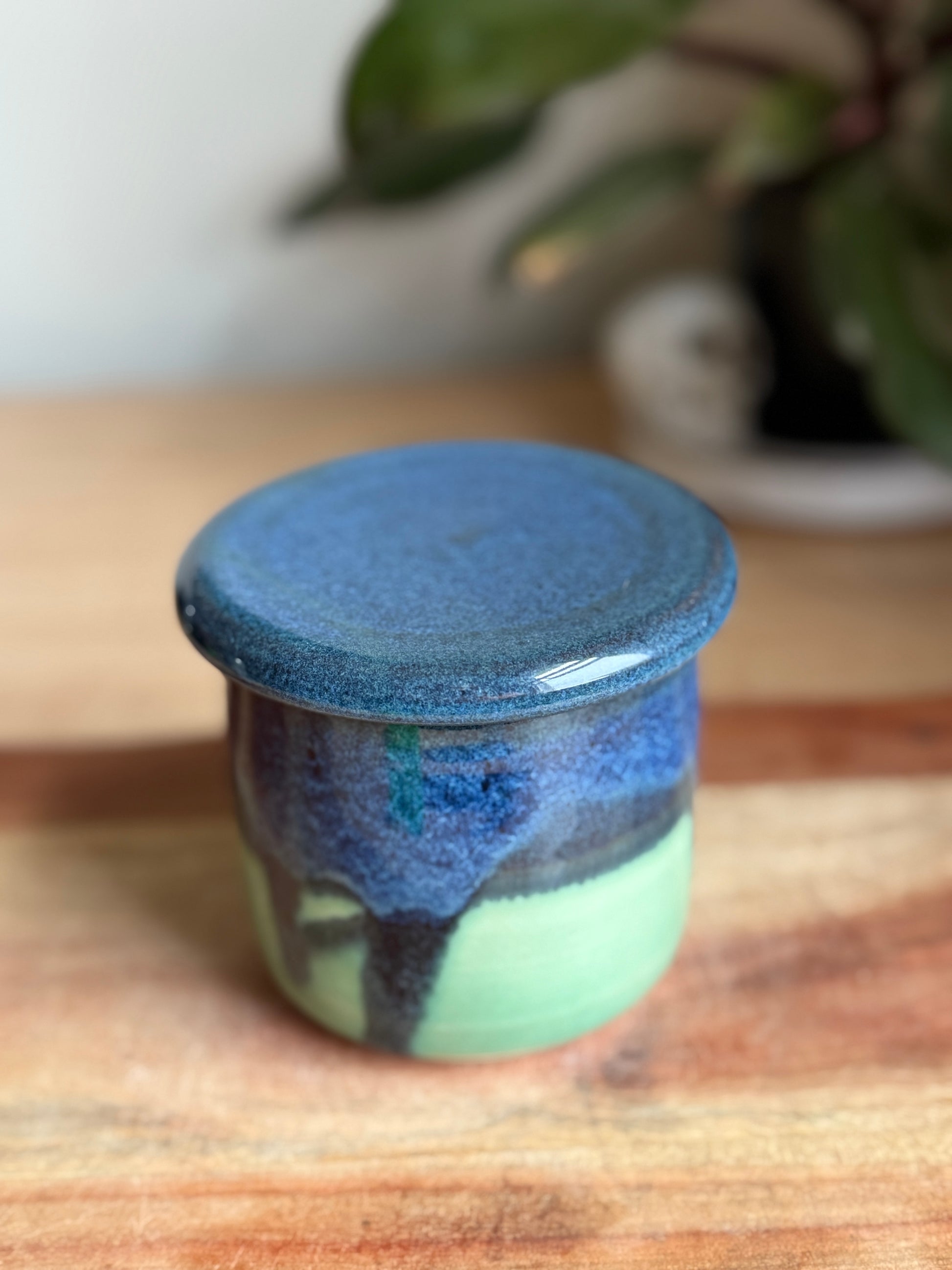 French butter bell in blue/green glaze. Made with white clay and measures about 3.5” tall and 3.5” wide.