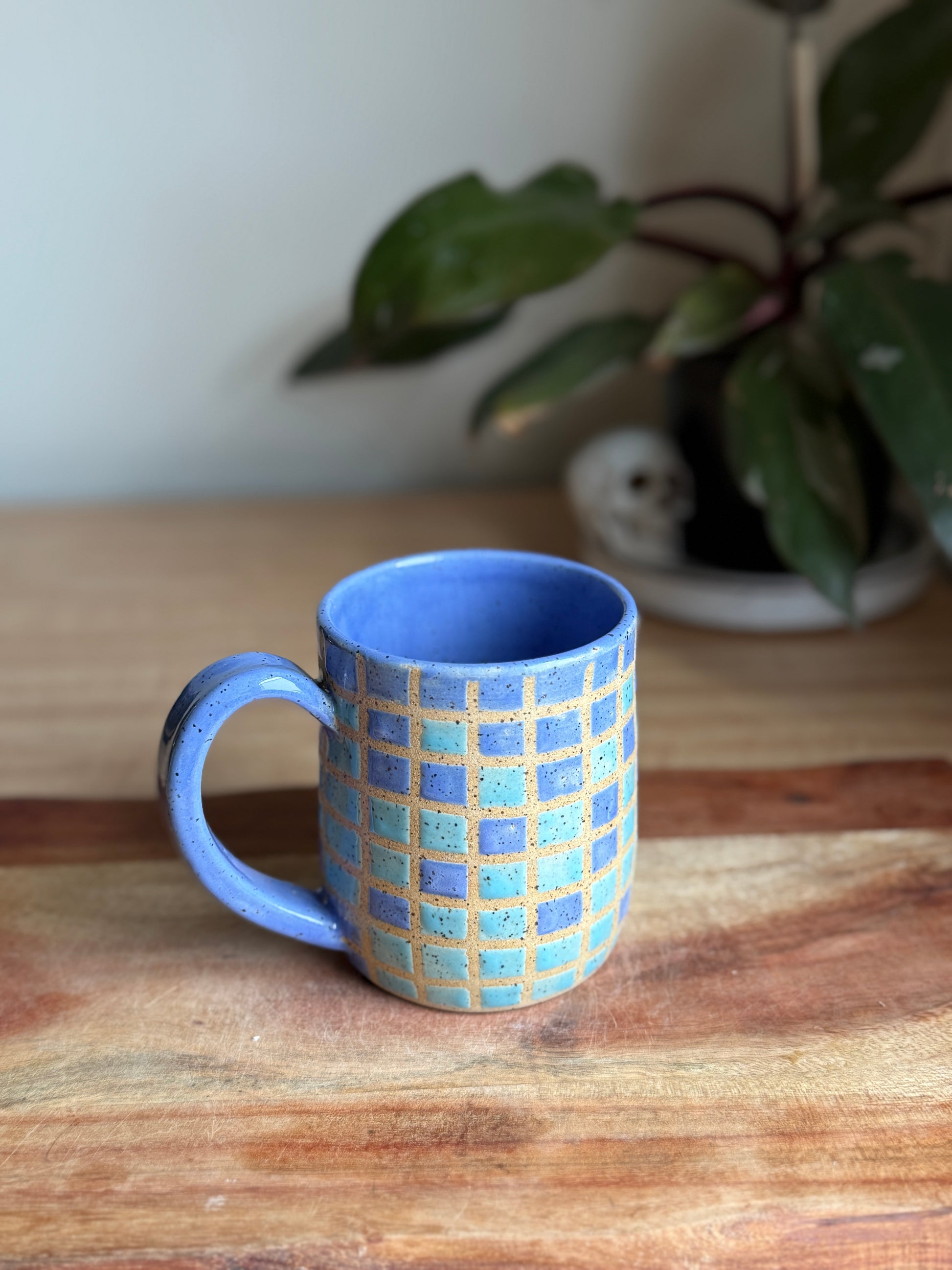 Blue mug with a grid pattern highlighting different coloured in two shades of blue. Made with white speckled clay and holds approximately 16 oz.