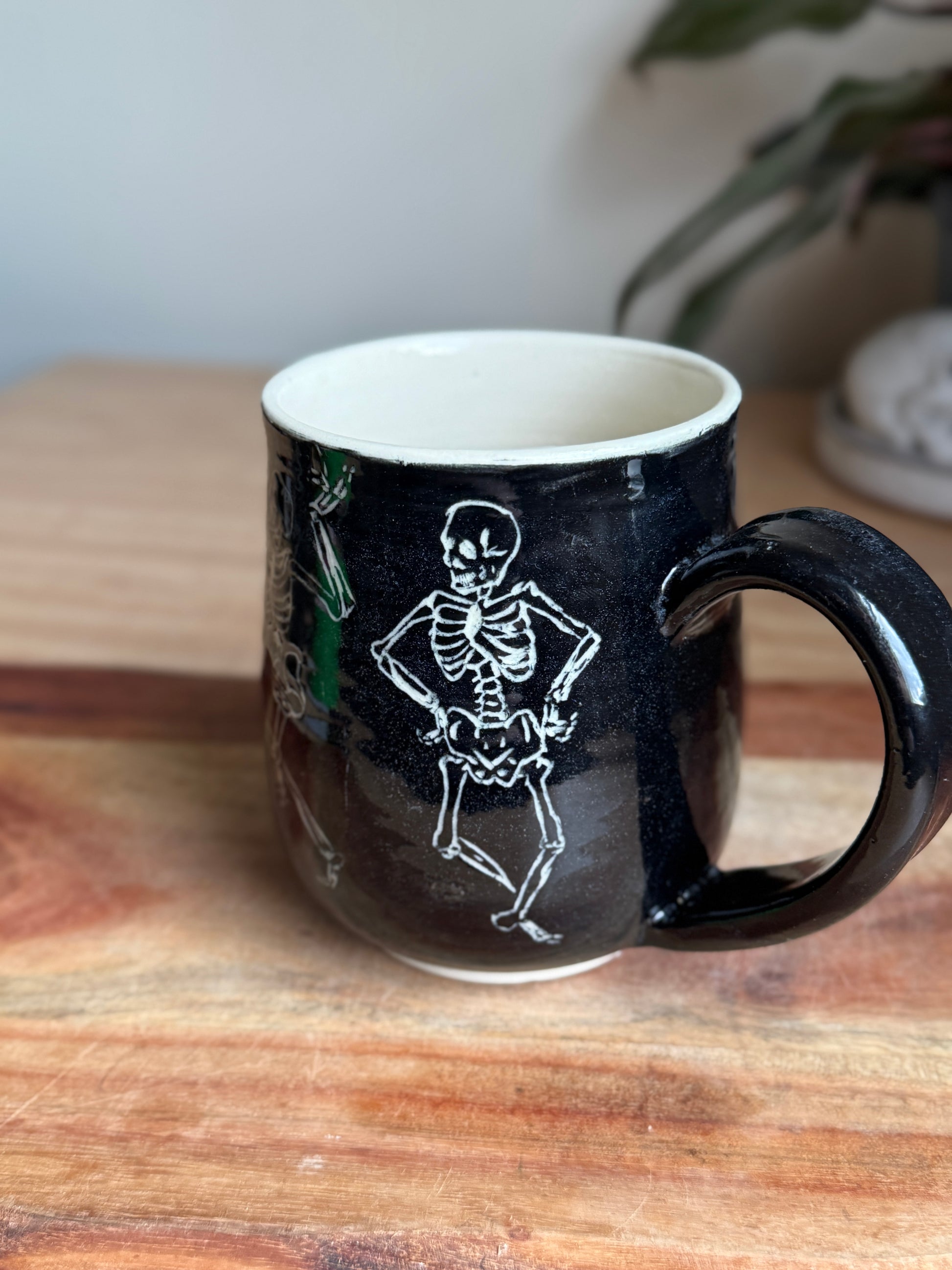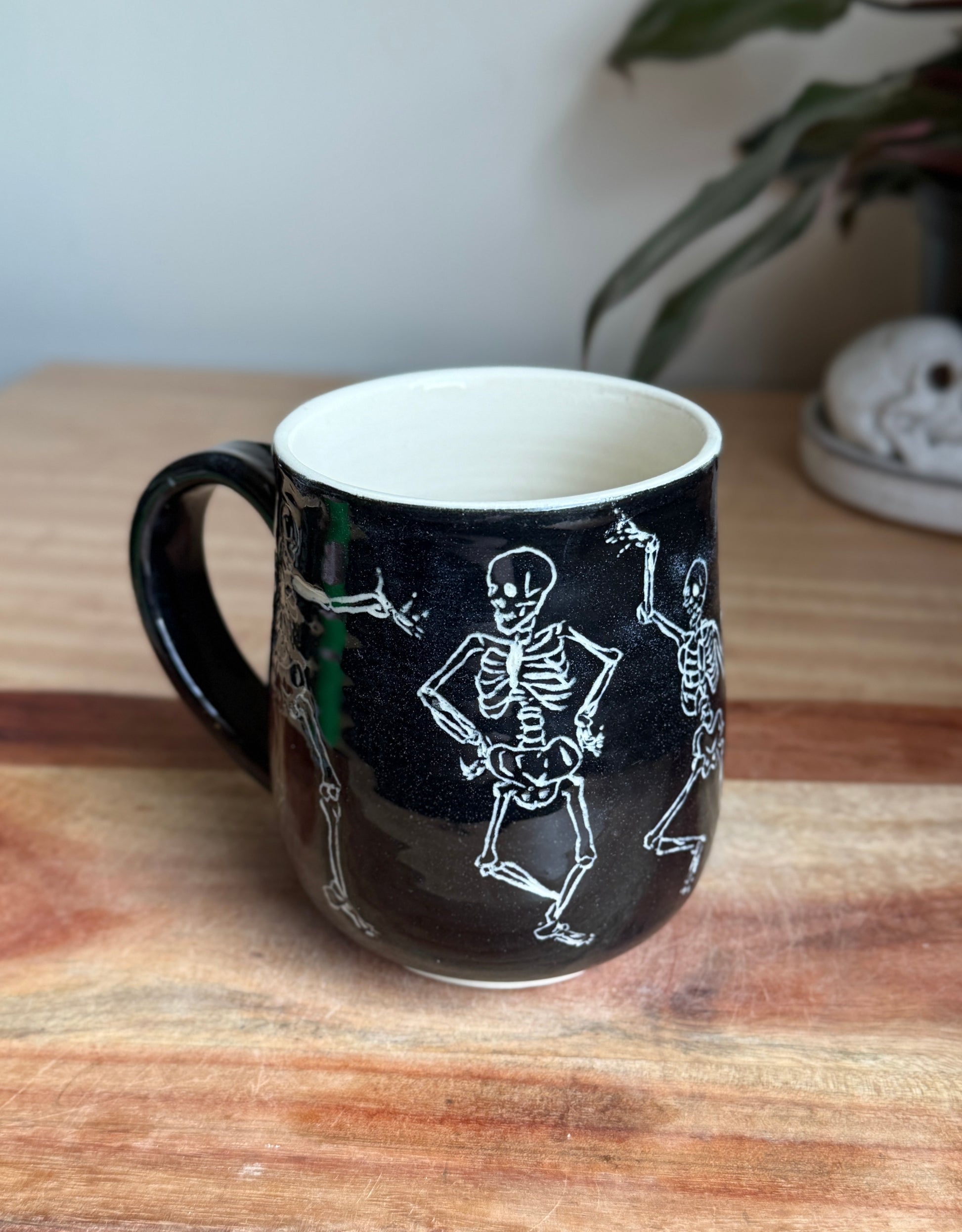 Sgraffito mug with hand carved dancing skeletons. Made with white clay and holds approximately 19 oz.
