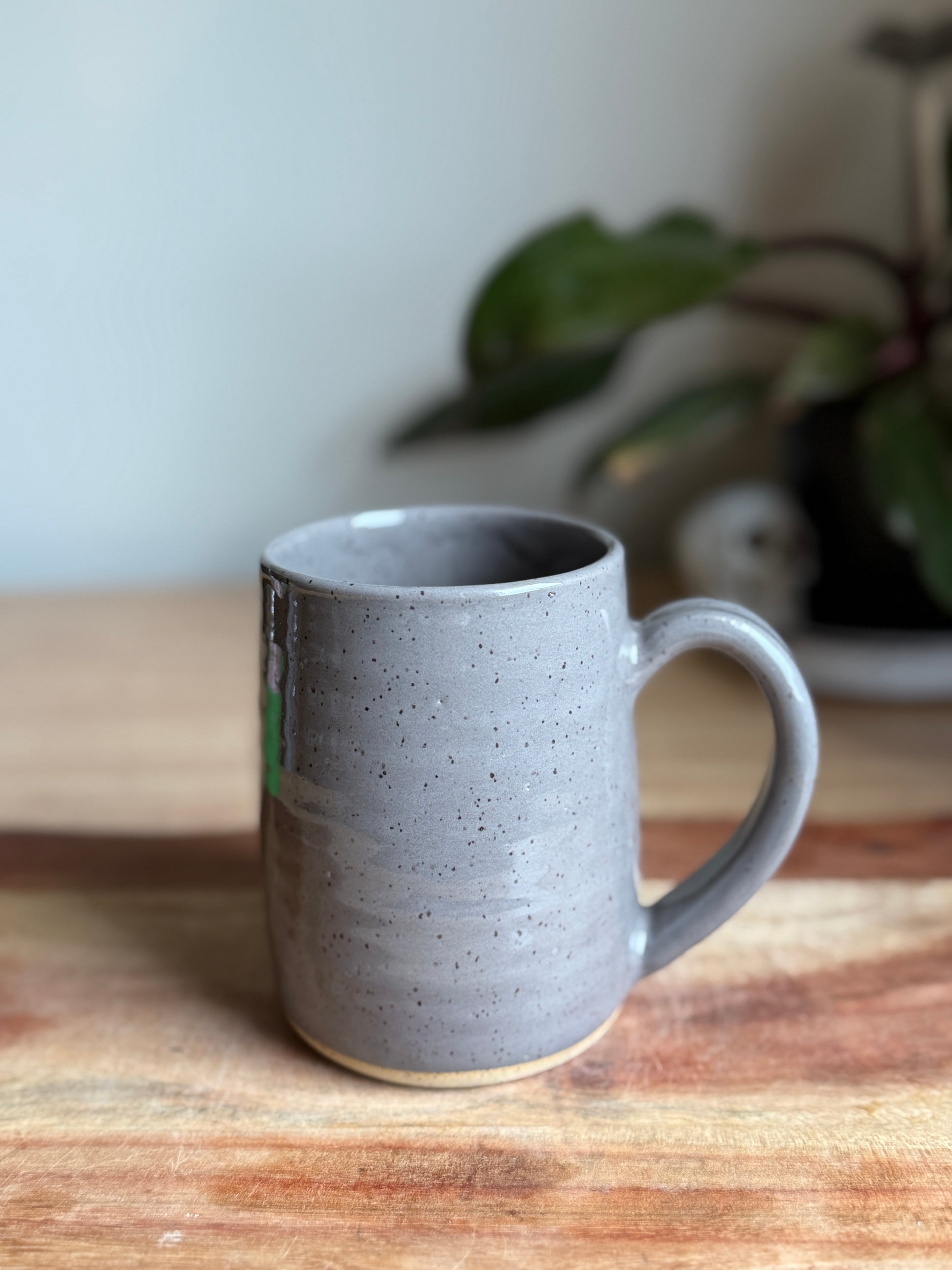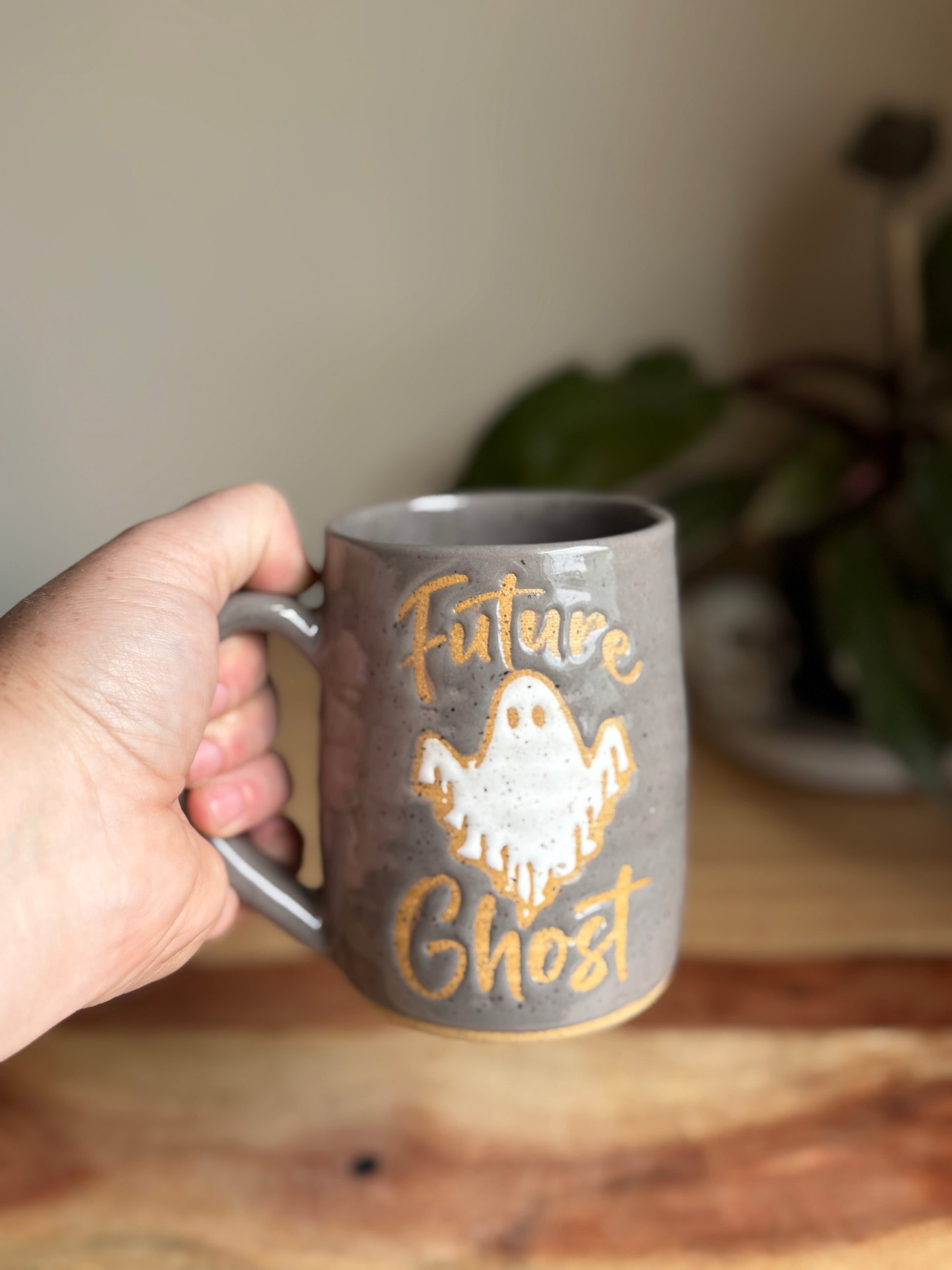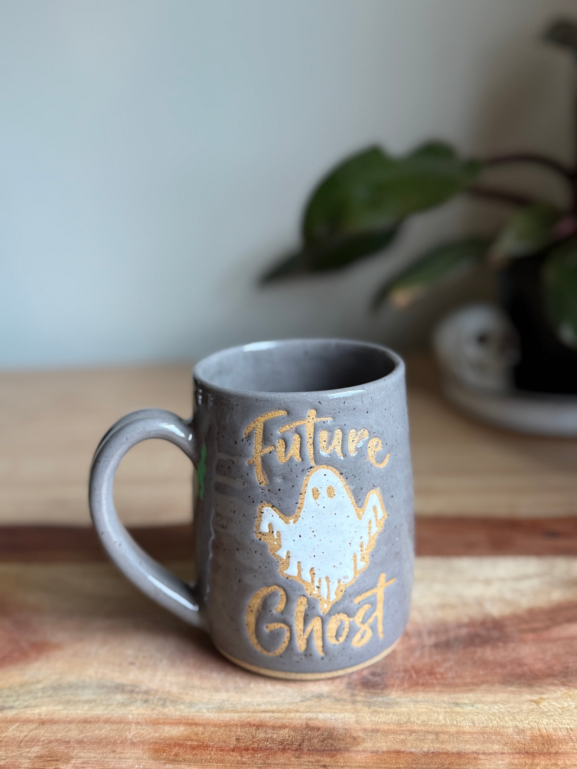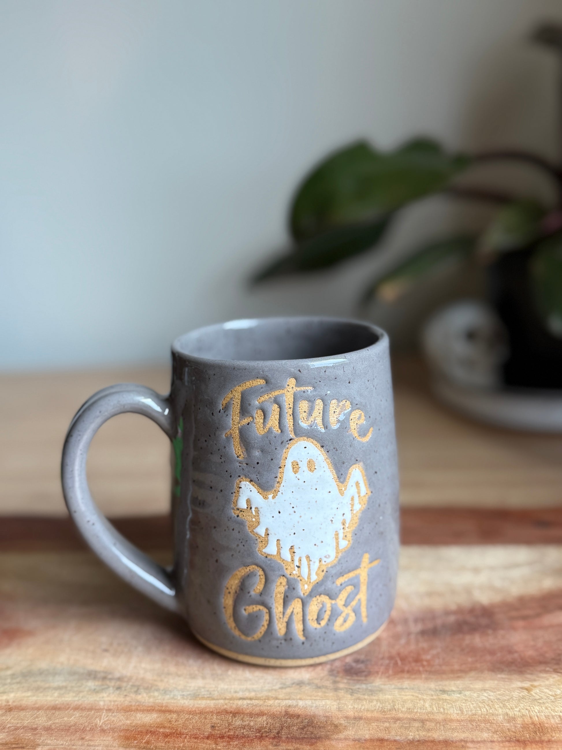 Grey mug with “Future Ghost” with a white ghost. Made on a white speckled clay body. Holds approximately 15oz.