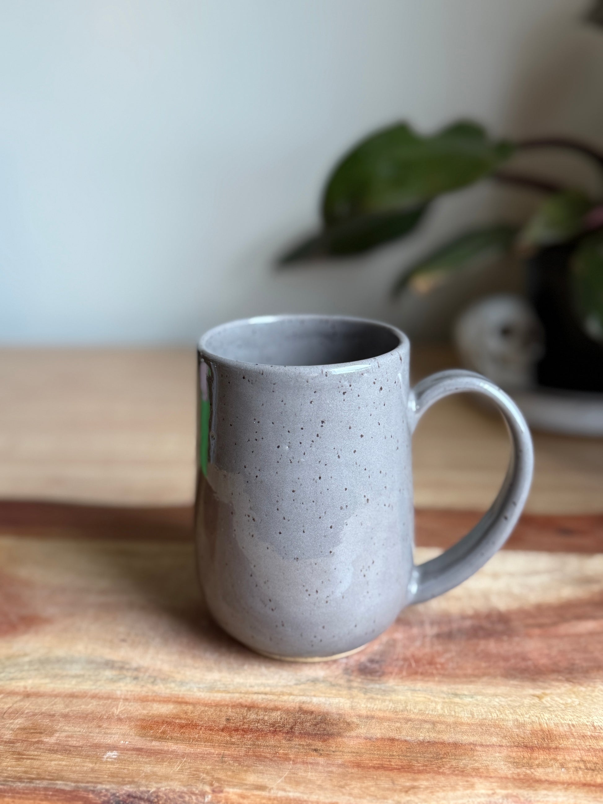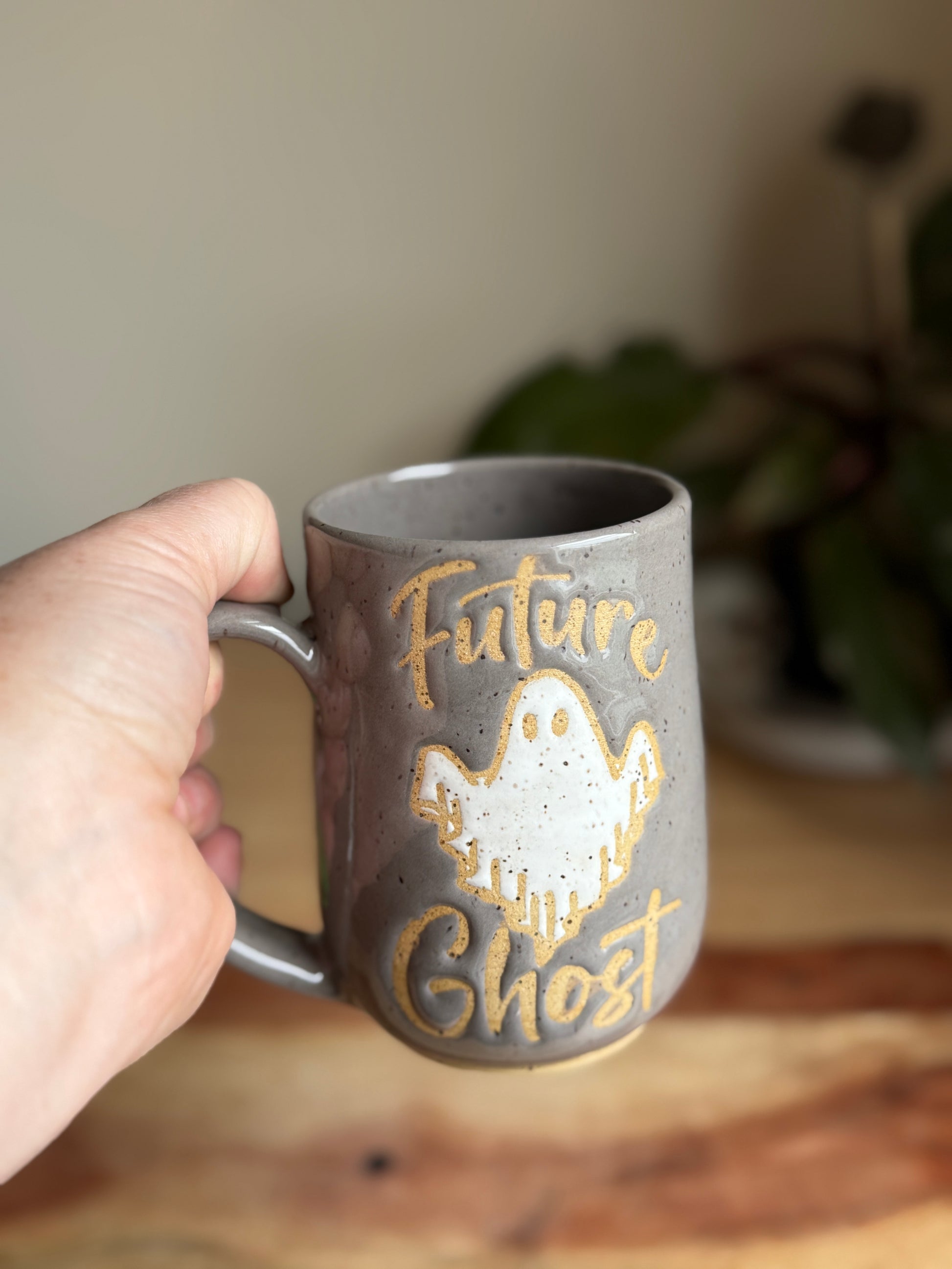 Grey mug with “Future Ghost” with a white ghost. Made on a white speckled clay body. Holds approximately 16oz.