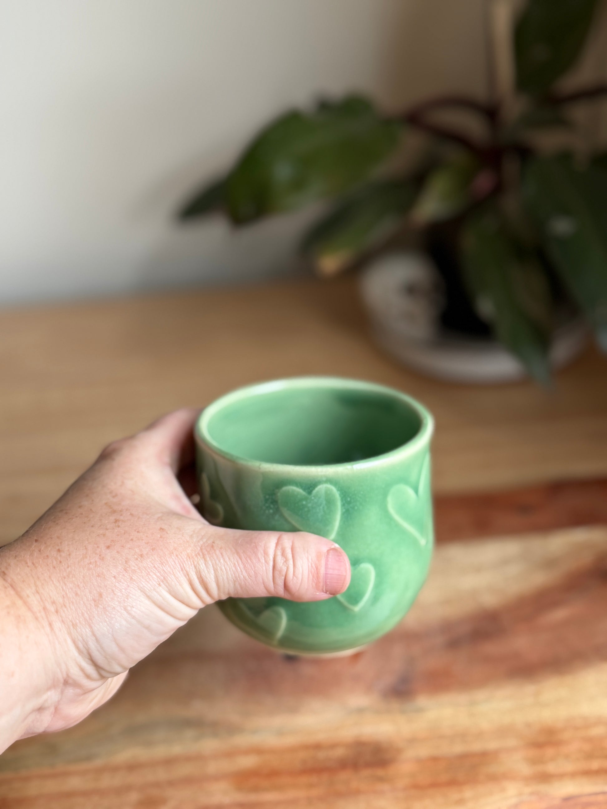 Green glazed cup with 3D hearts. Perfect for wine or coffee or trinkets! Made with white clay and holds approximately 13 oz.