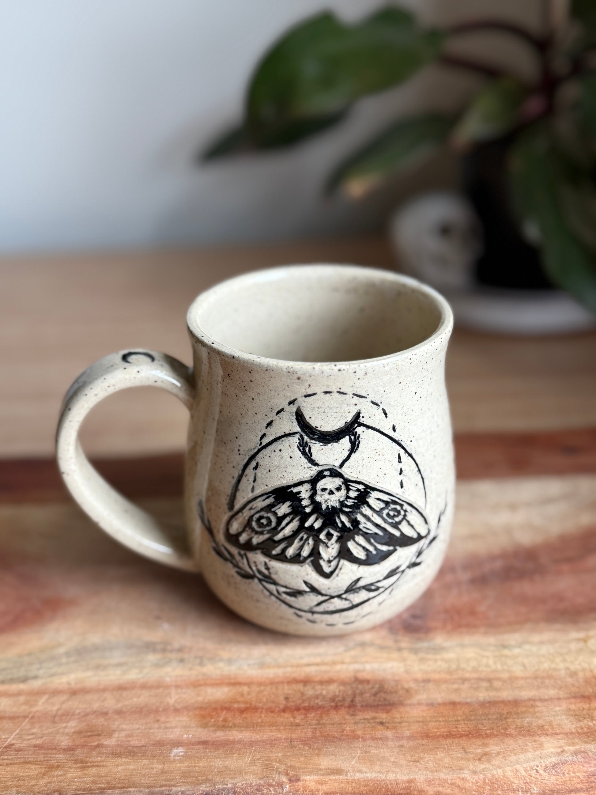 Speckled cream mug with a sgraffito carved design of a hawk moth with moon and leaves. Holds approximately 20 oz.