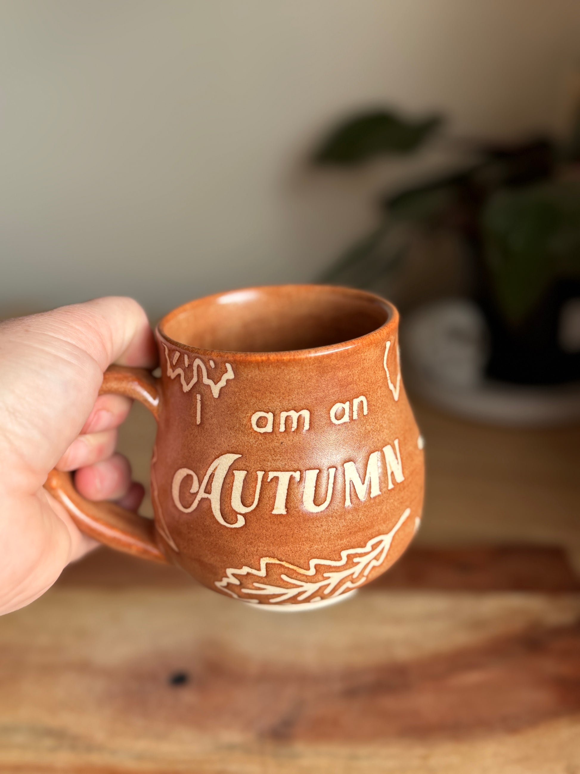 Nutmeg/ rusty orange coloured mug with the text “I am an Autumn” and leaves on it in resist. This is a quote from Richard Gilmore in the Gilmore Girls. It is made with white clay and holds approximately 15 oz.