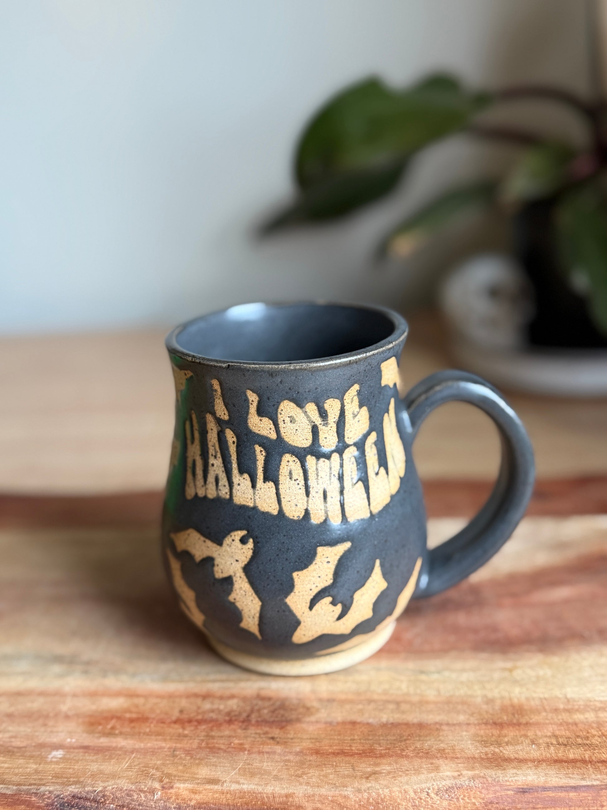 Matte black mug with the text “it’s fricken bats” and “I love Halloween” inspired by the Katie Ryan video. It also has multiple bats on it all in resist showing the brown speckled clay. Holds approximately 16 oz.