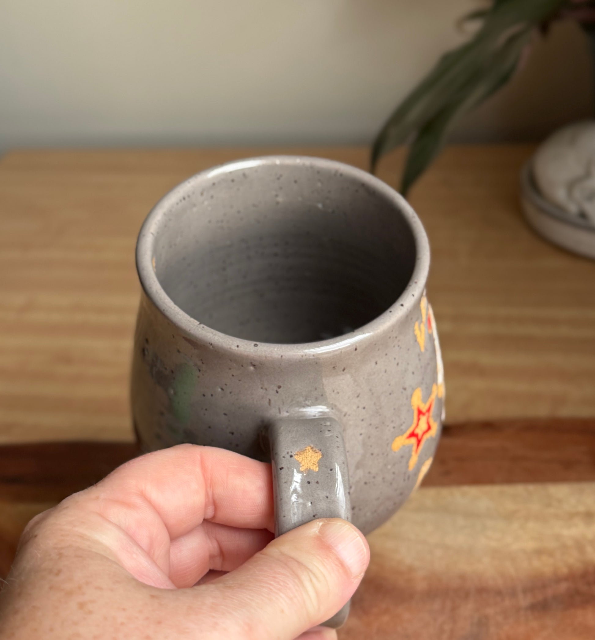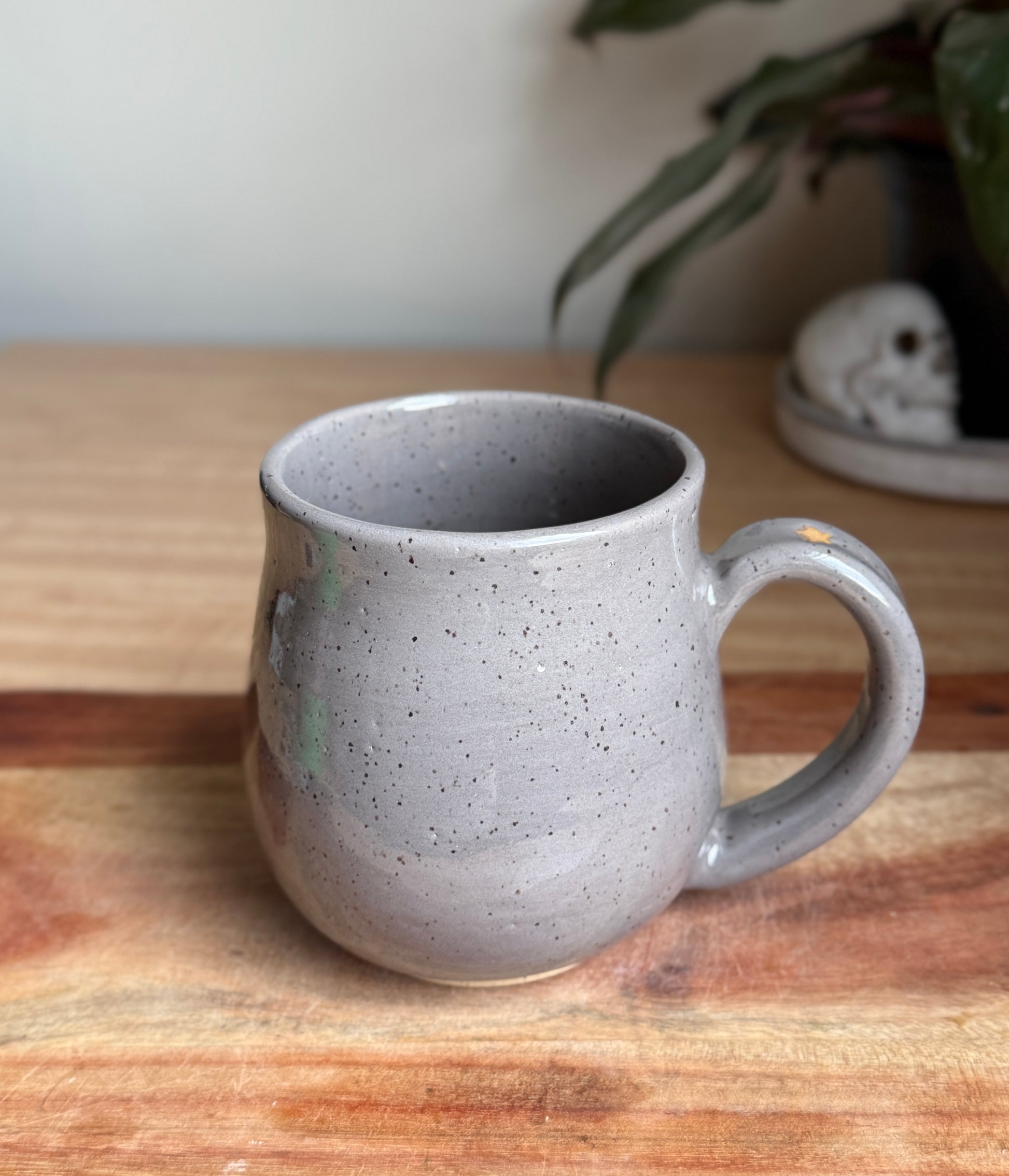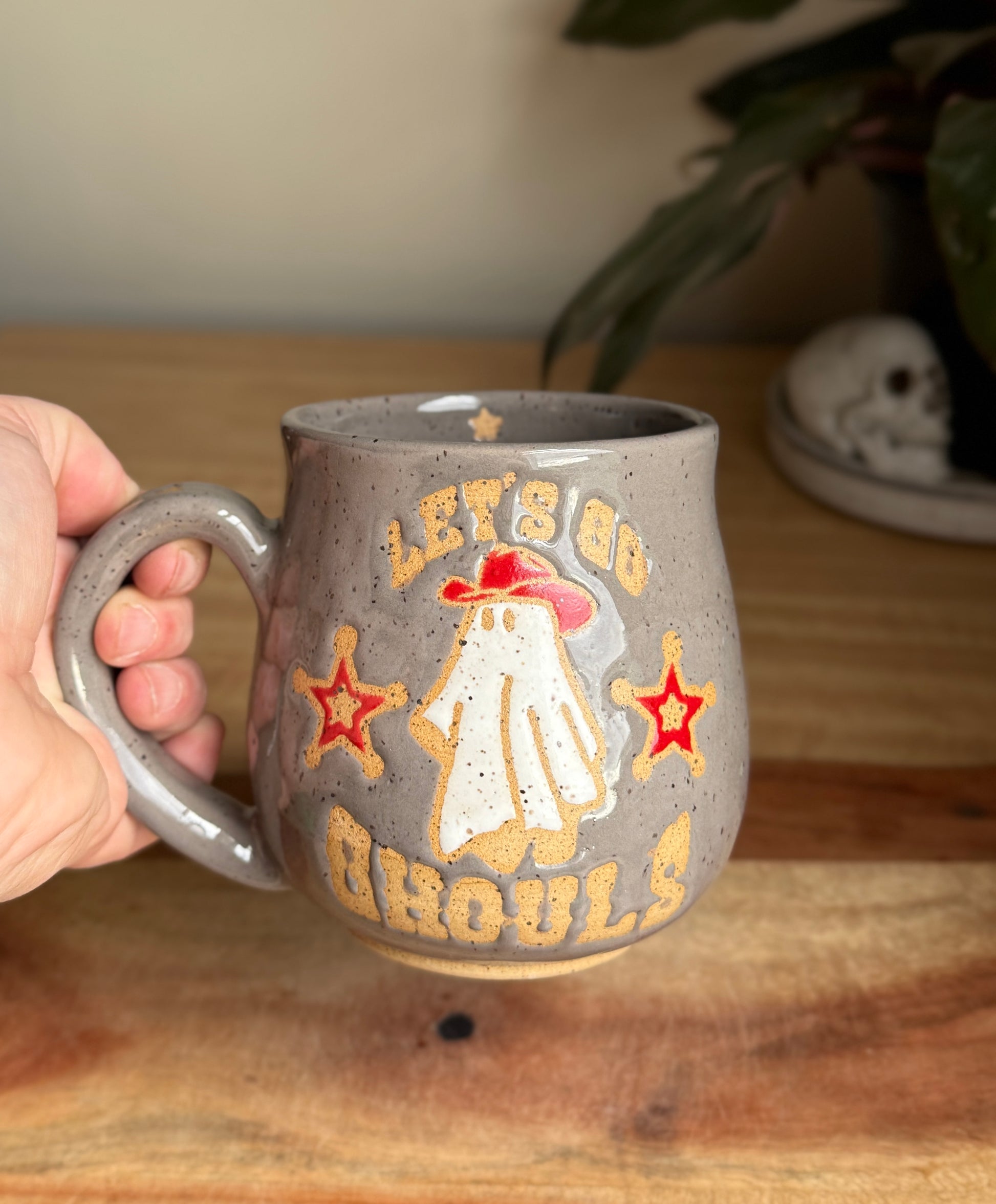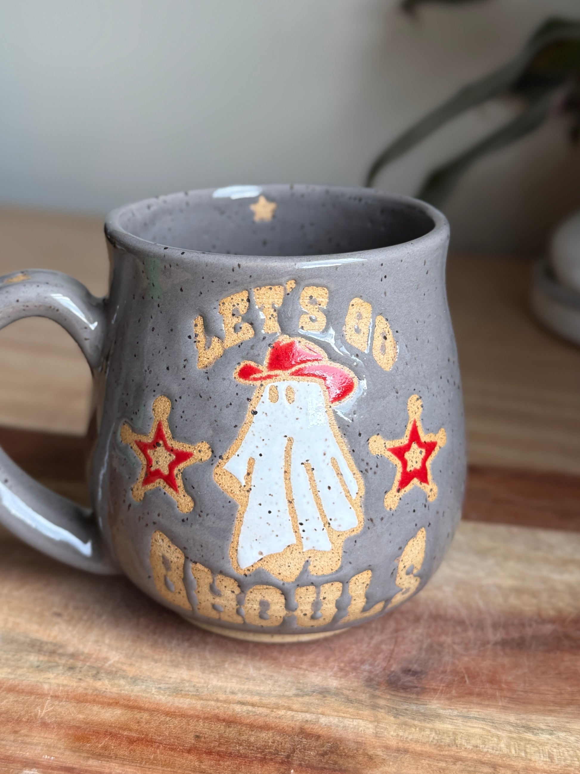 Gloss grey mug with a cowboy ghost wearing a red cowboy hat and the text “let’s go ghouls” a La Shania Twain. Also features two red western style 5 point star. Made with light speckled clay and holds approximately 19 oz.