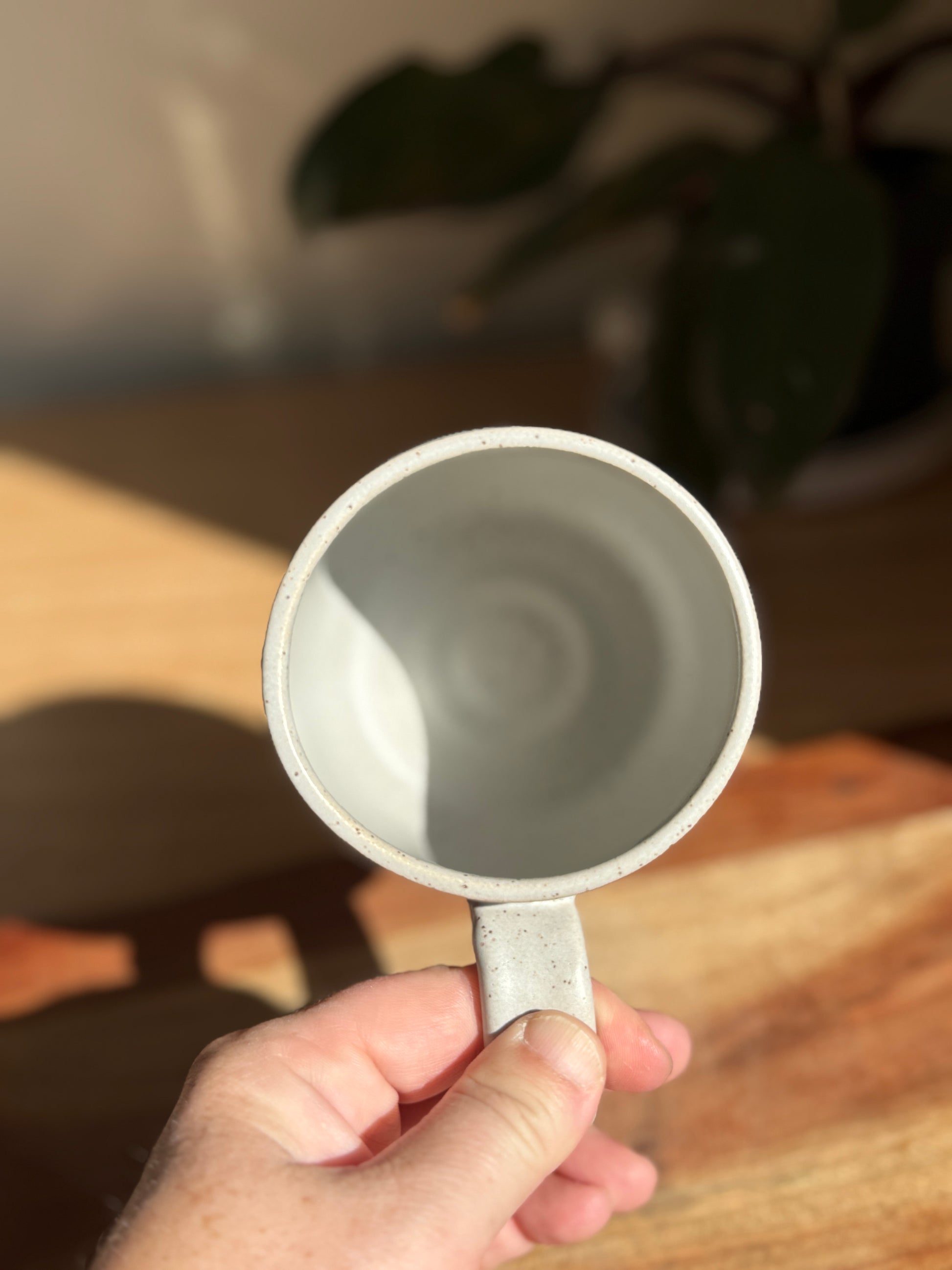 Matte grey with the “Luke’s” logo on it from Gilmore Girls. Made with white speckled clay and holds approximately 20 oz.