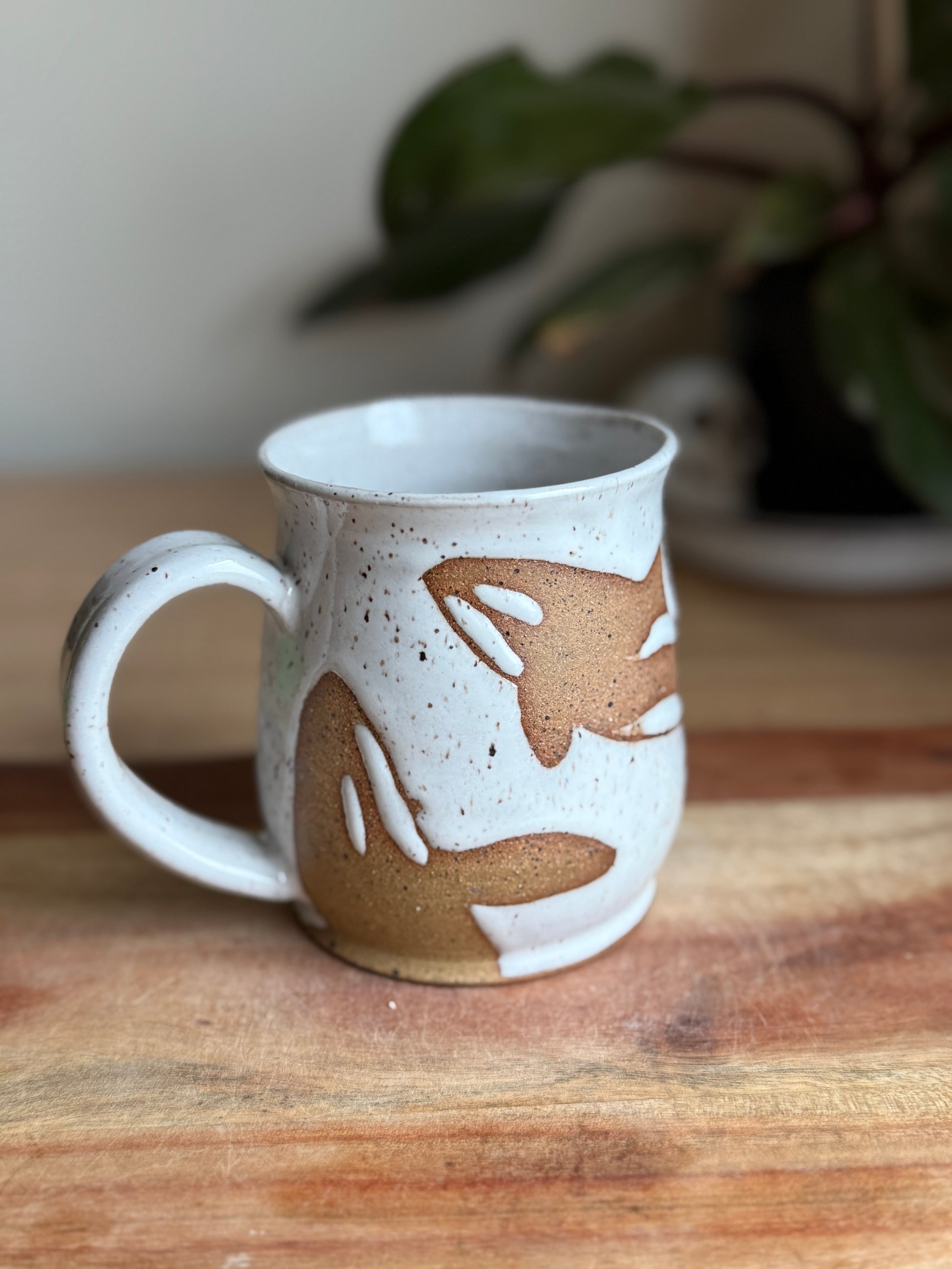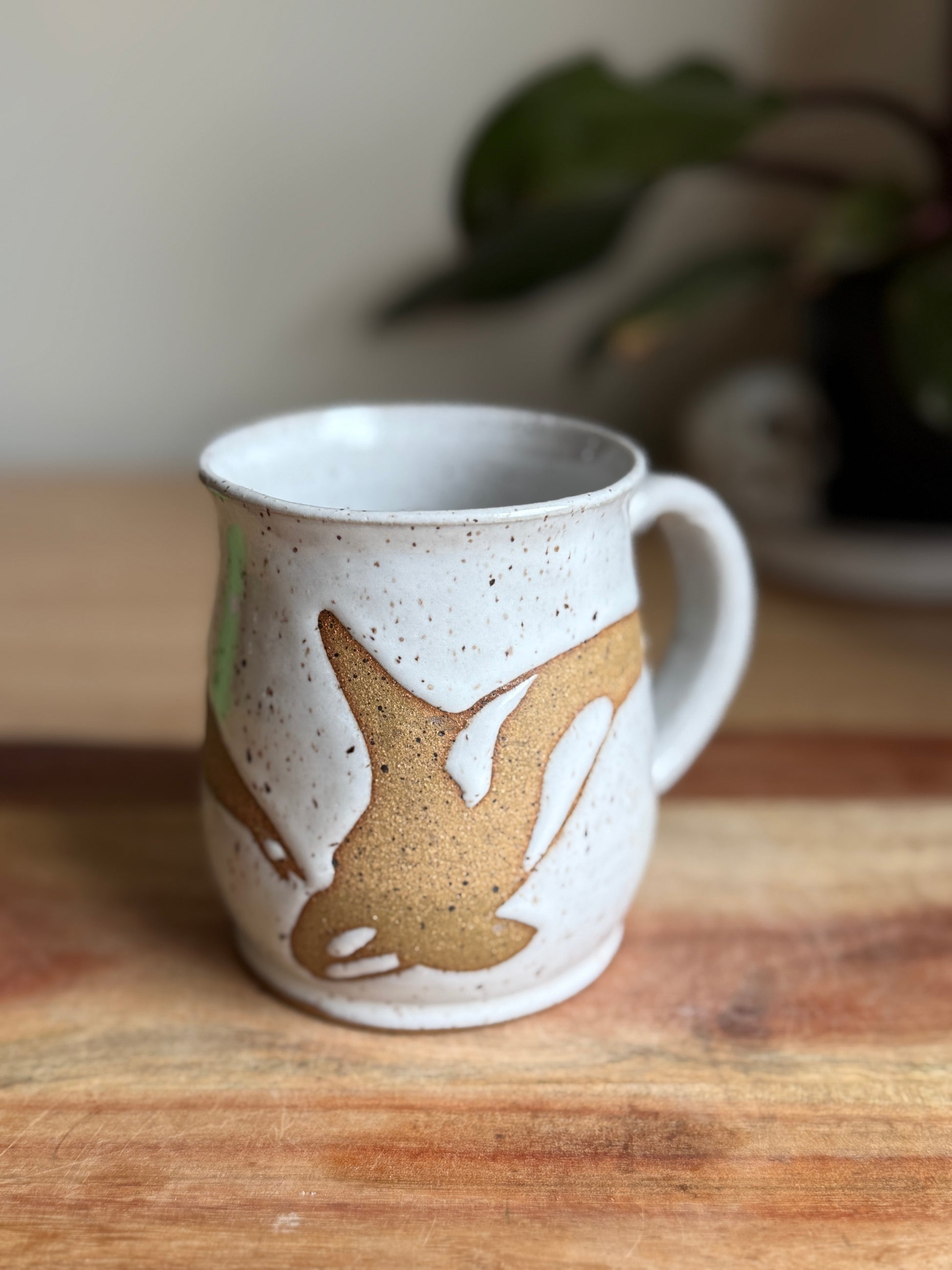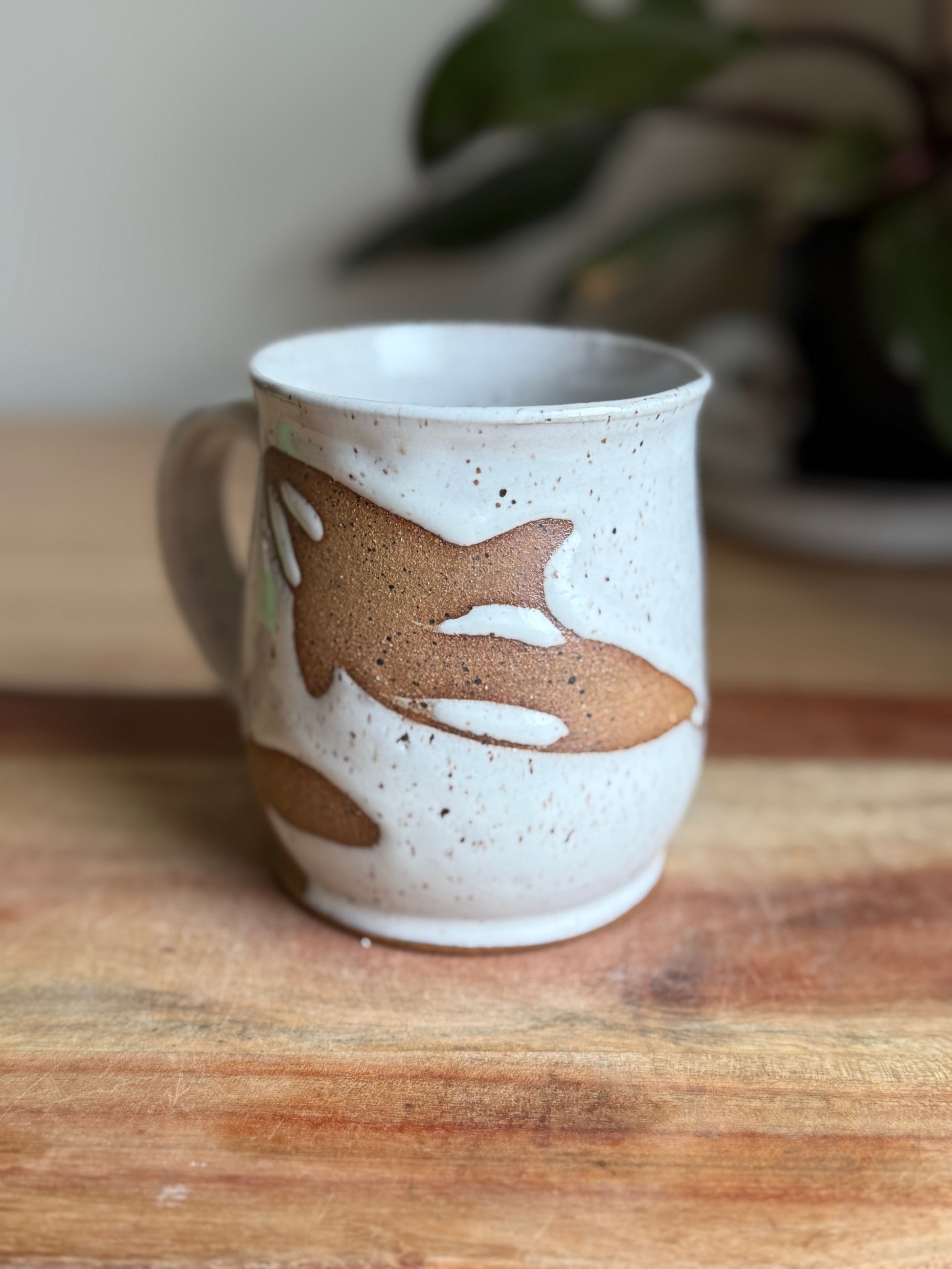 Gloss white mug with orcas on it in resist, showing the brown speckled clay through the glaze. Holds approximately 17 oz.