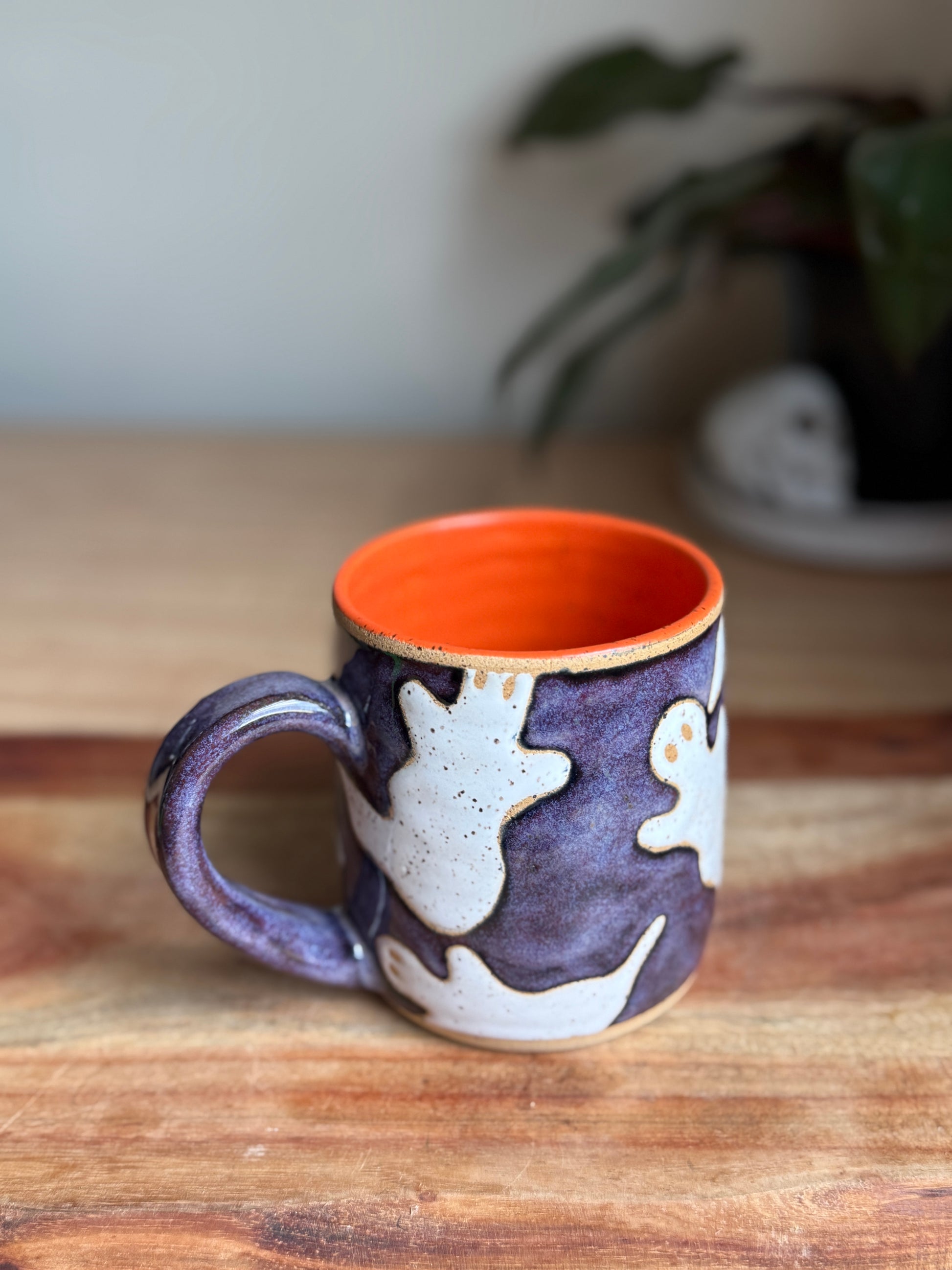 This mug has a purple gloss exterior with white ghosts floating around it and a matte orange glaze lining the interior and the rim. Made with light speckled clay and holds approximately 16 oz.