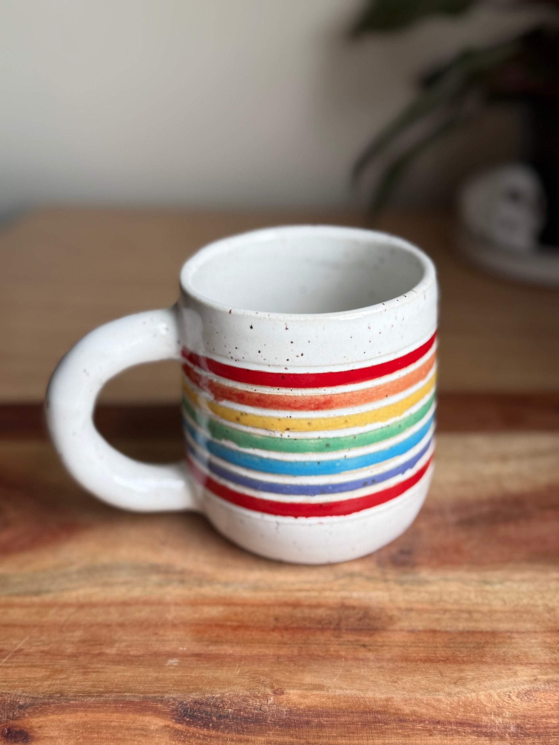 Gloss white mug with rainbow stripes around it. Made with white speckled clay and holds approximately 20 oz.