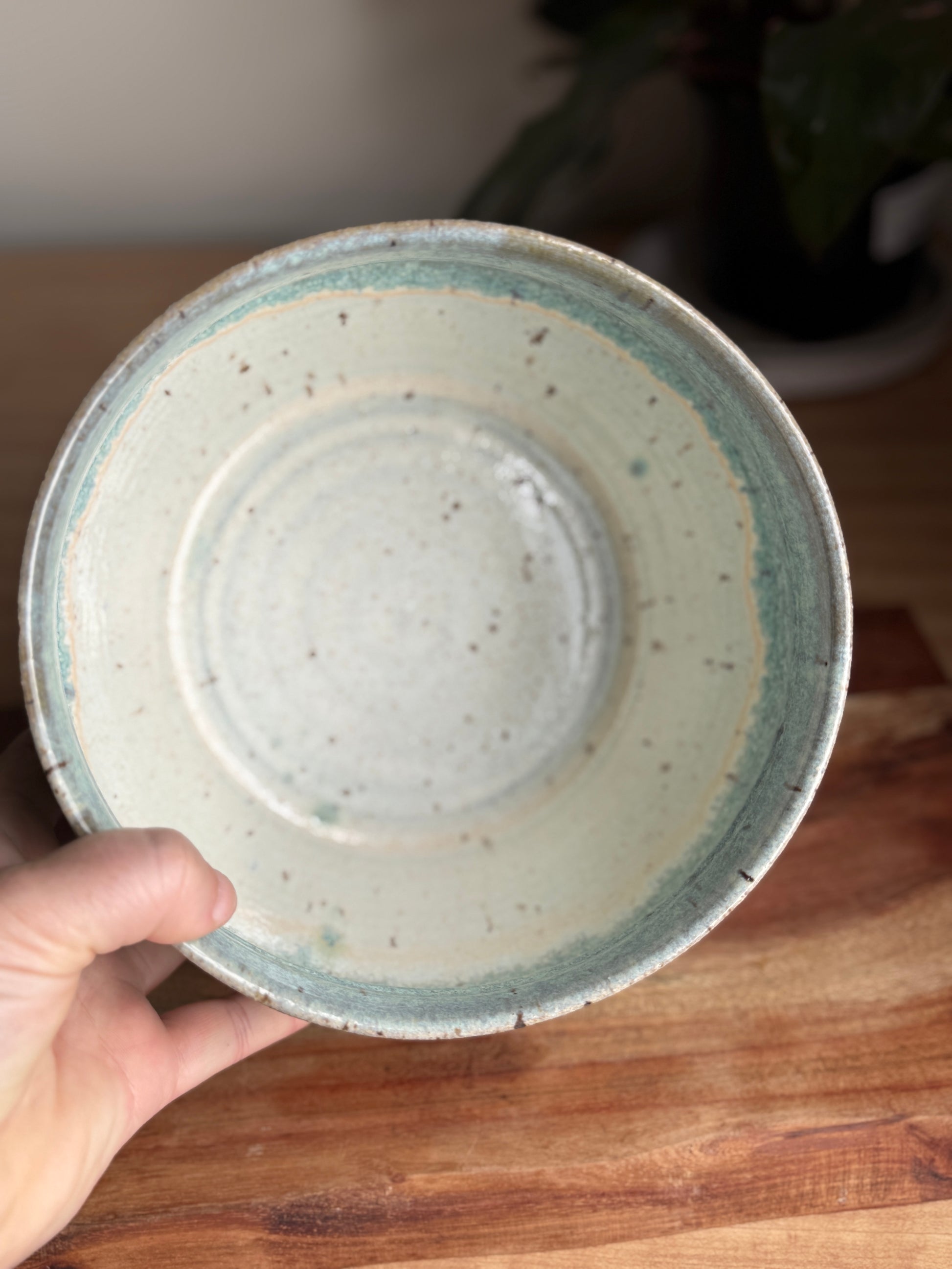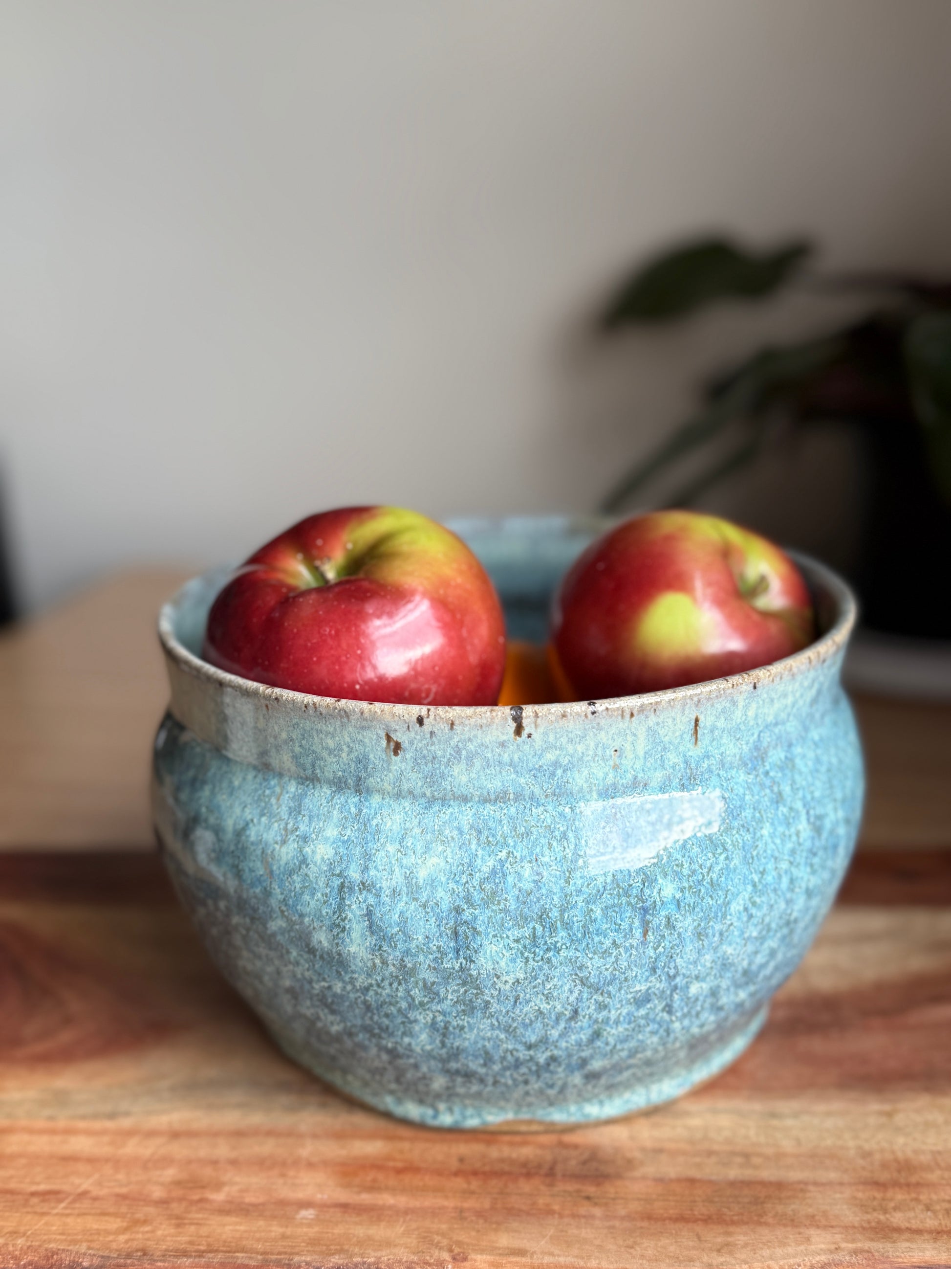 Large blue bowl perfect for holding your fruit or a big salad! Made with brown speckled clay and features a blue/cream glaze. Stands approximately 5” tall and measures 7.25” across the rim.